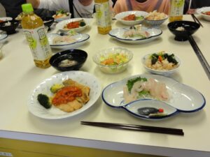 当日は、24組64名にご参加いただき、サケのマリネ・タイの刺身とアラ汁・アジのムニエル・タコ飯を料理しました。
